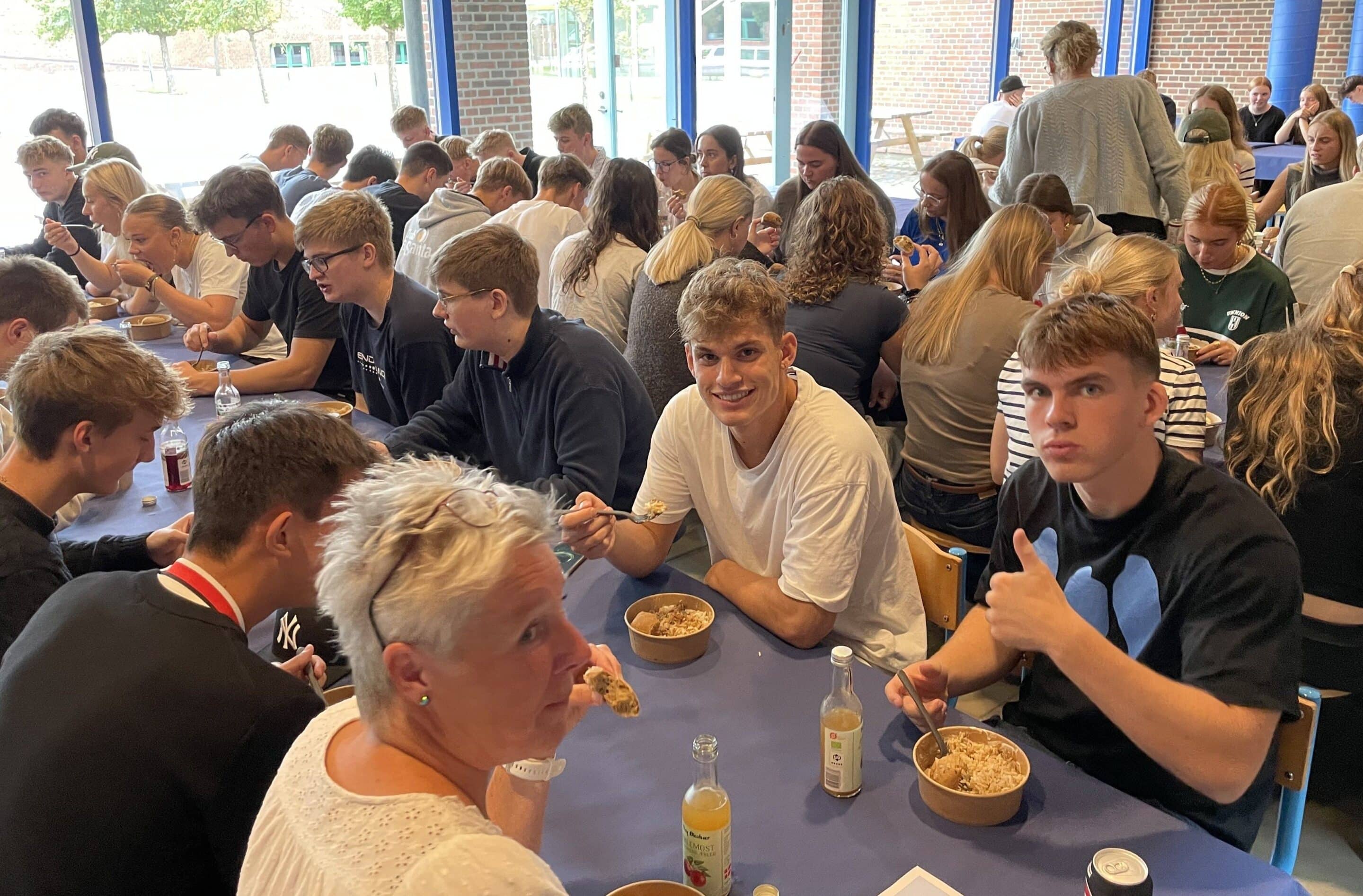 I alt satte omkring 1.300 elever, kursister og medarbejdere sig til bords for at markere begyndelsen på skoleåret. Menuen bød på chili con carne eller chili sin carne, som den økologiske udgave af retten hedder.