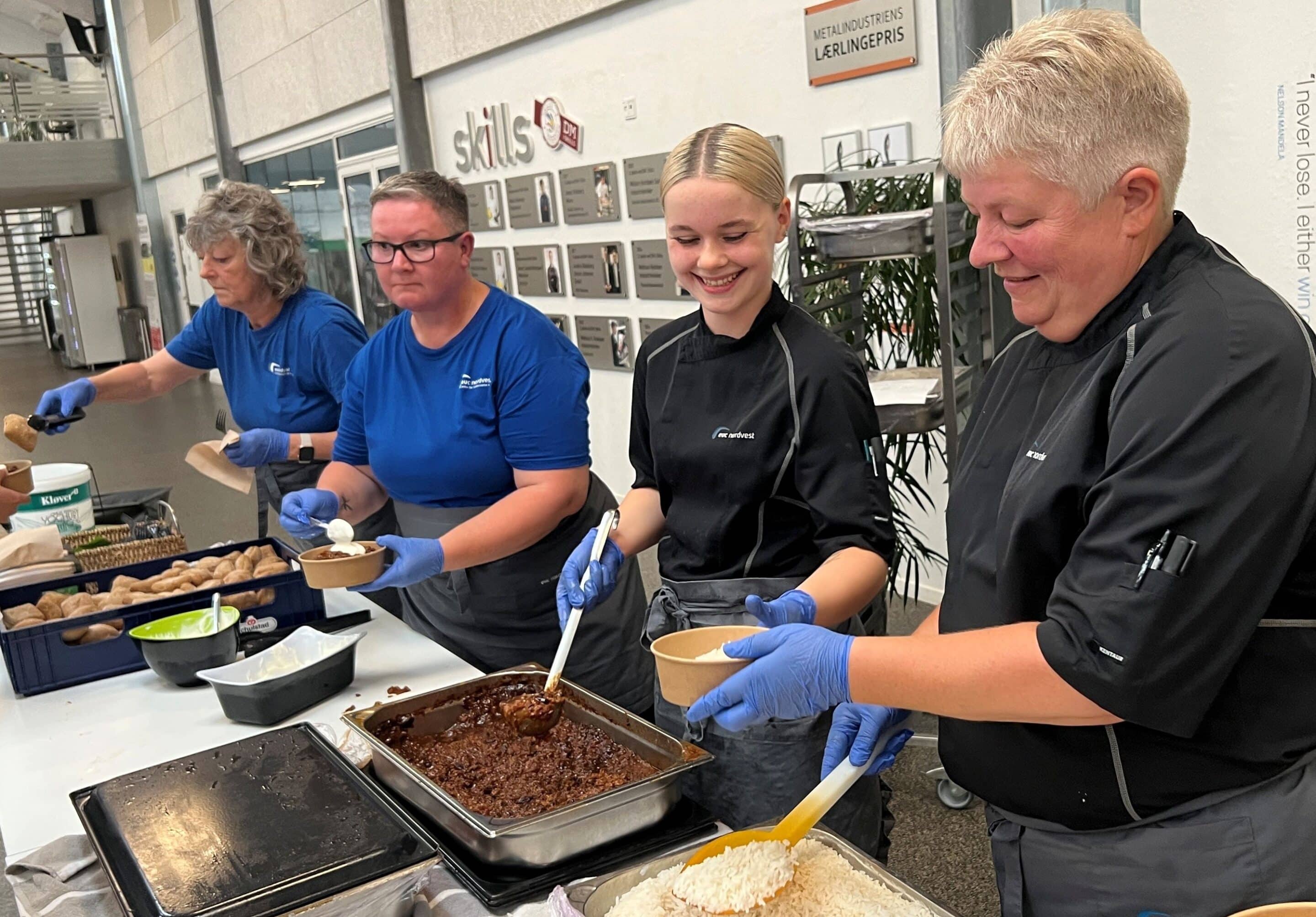 Skolens kantinepersonale selv stod bag både tilberedning og servering – i alt 1.300 portioner blev tilberedt af bl.a. 80 kilo oksefars, 70 kilo ris og 200 liter chilisovs.