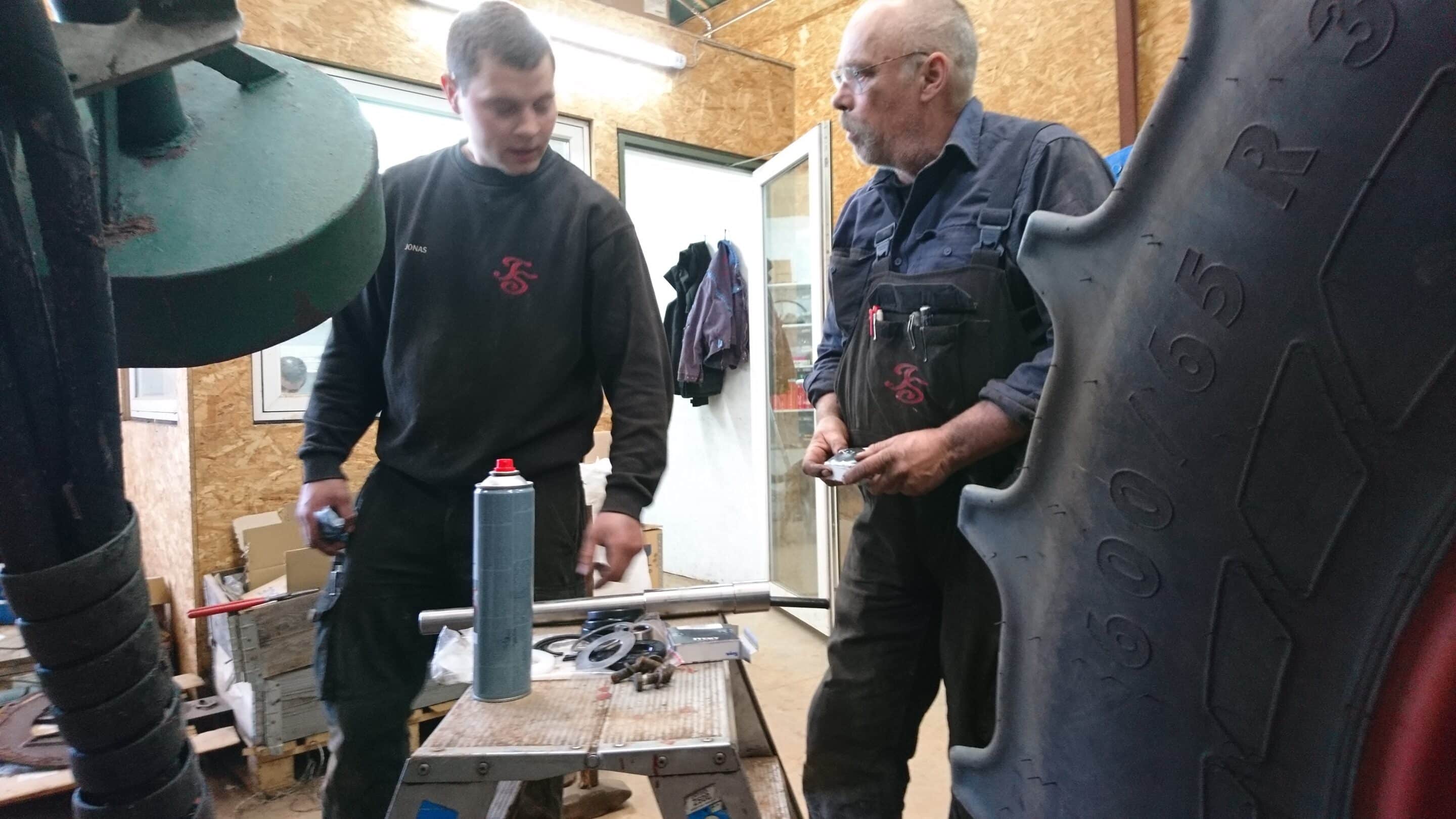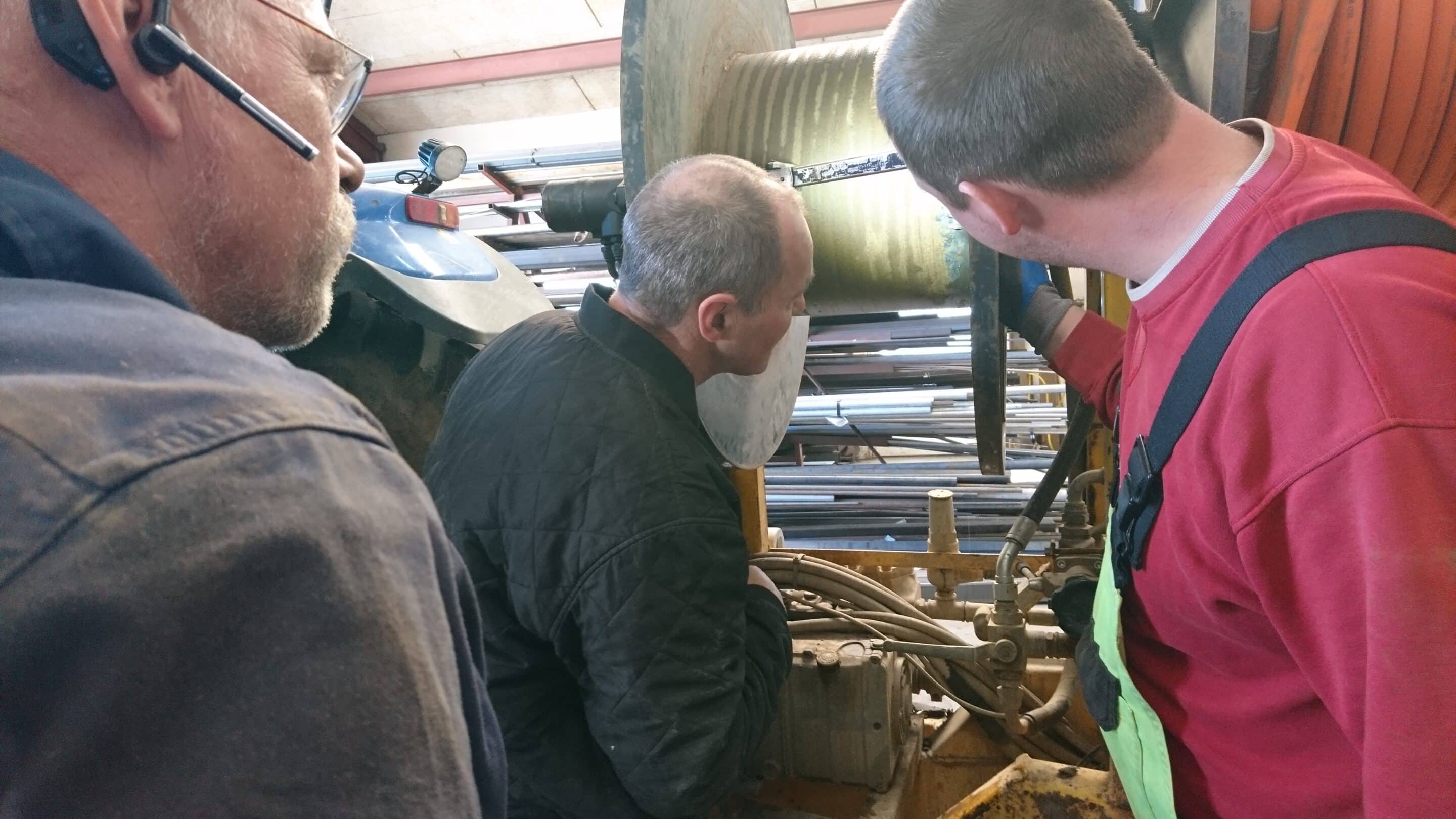 På billedet herover er det Kasper i rød trøje og Brian, der drøfter reparationen af en utæt spuler, mens Tage Nygaard giver sit besyv med.