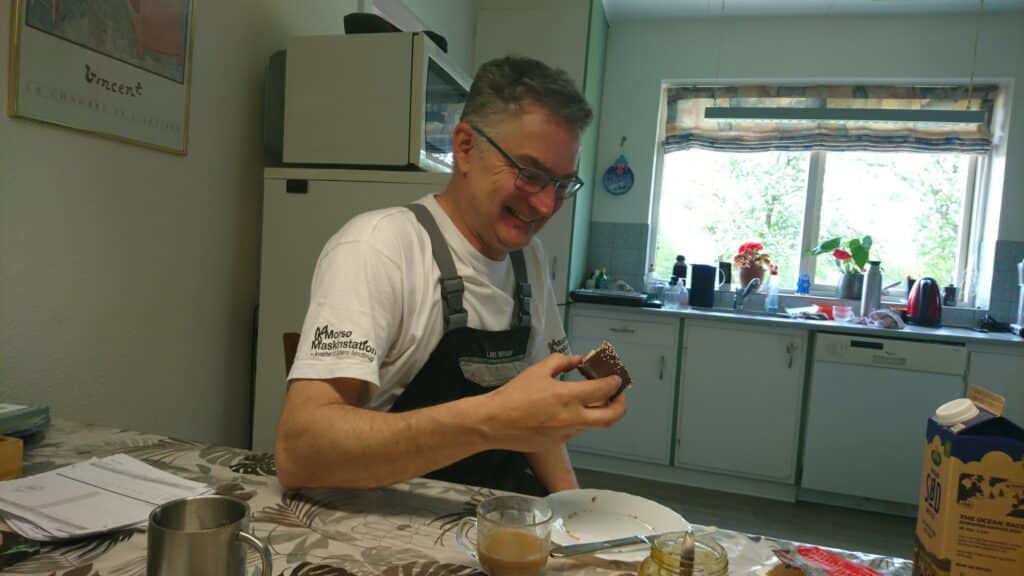 På dette tidspunkt i samtalen rejser Lars Brian Hovmøller sig fra køkkenbordet for at hente nye forsyninger til kaffen.