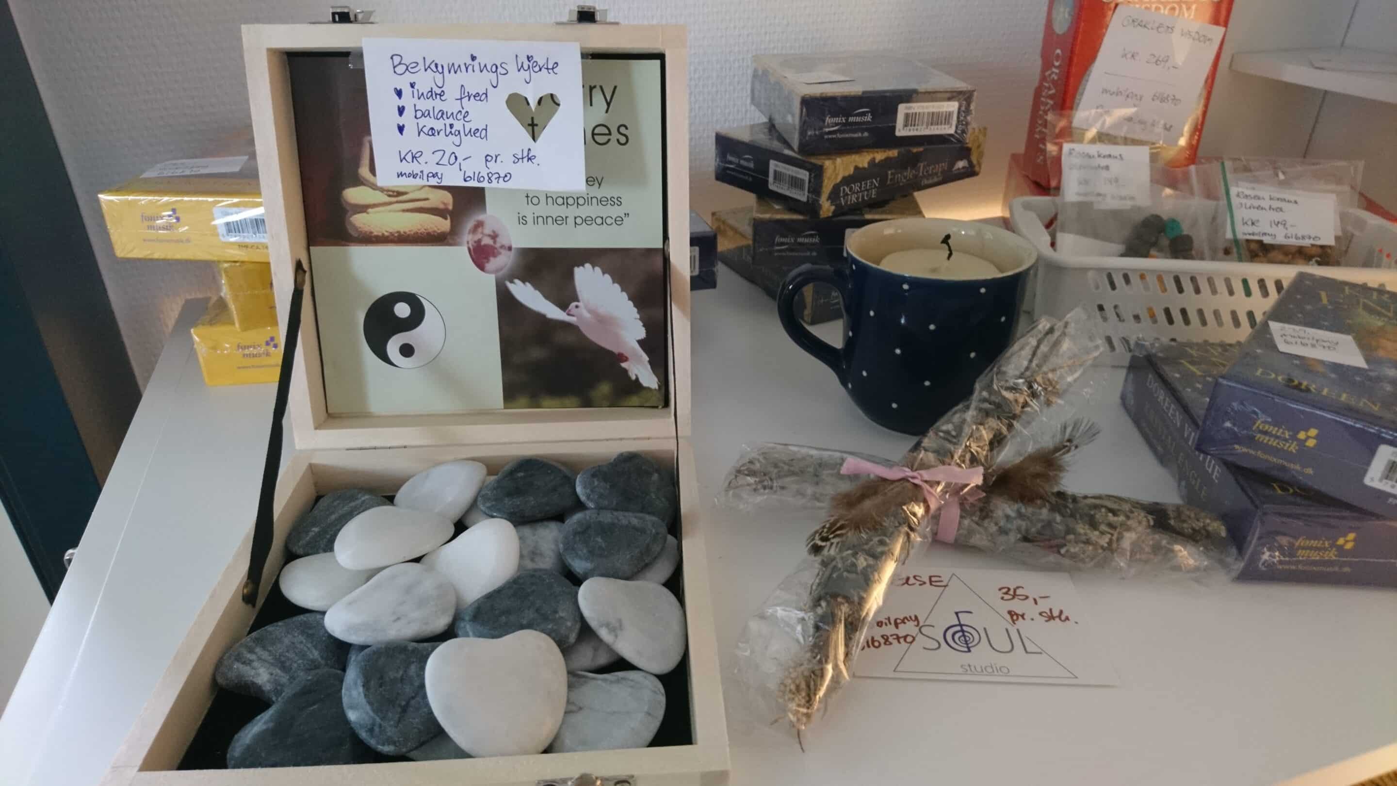 Der sælges også smukke hjertesten og krystaller, som giver ro og styrke.