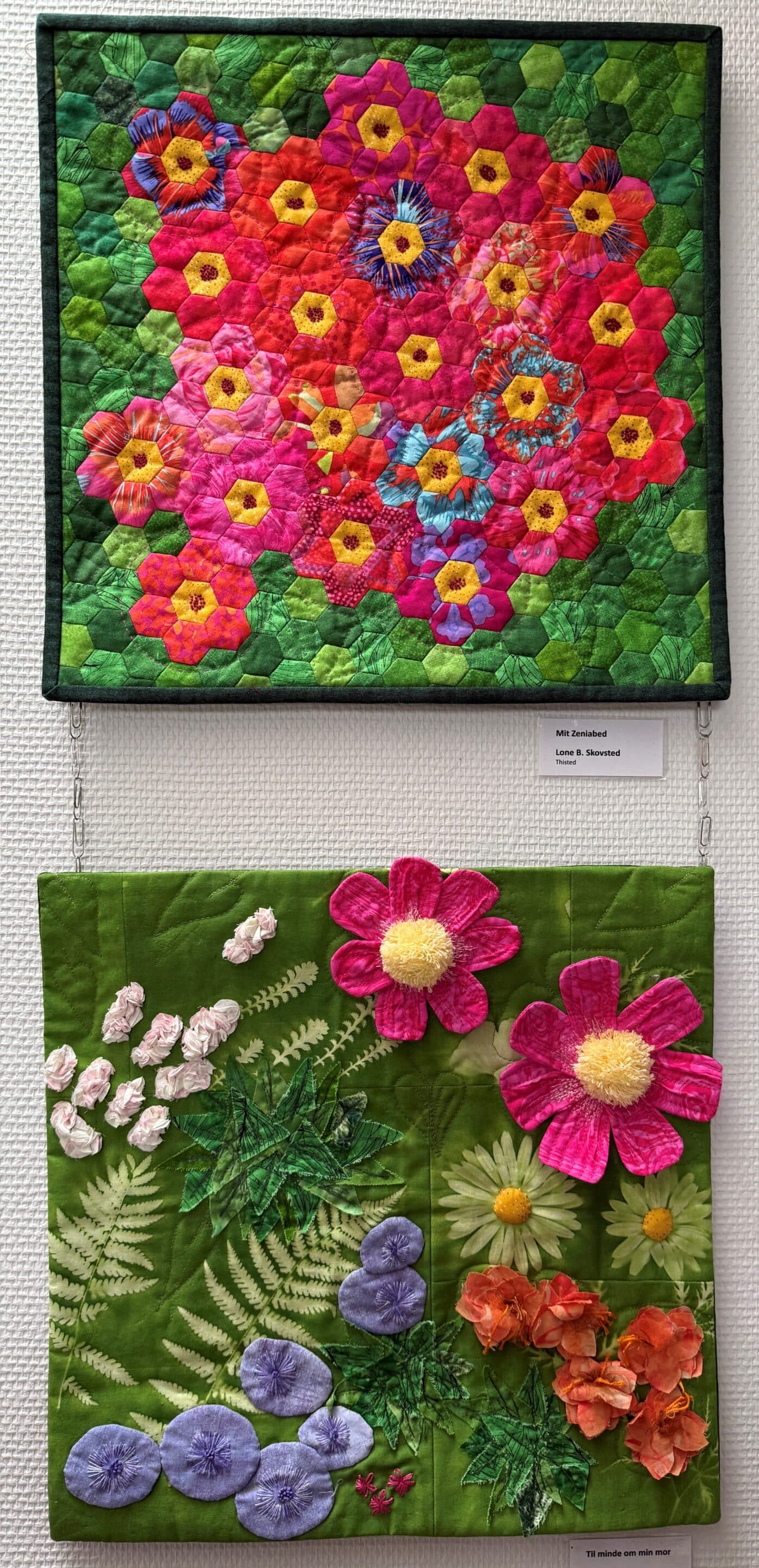 Patchworkbilleder i temaerne eventyr og blomster, lavet af Limfjordsgruppen, og keramik, skabt af Grethe Ørberg.