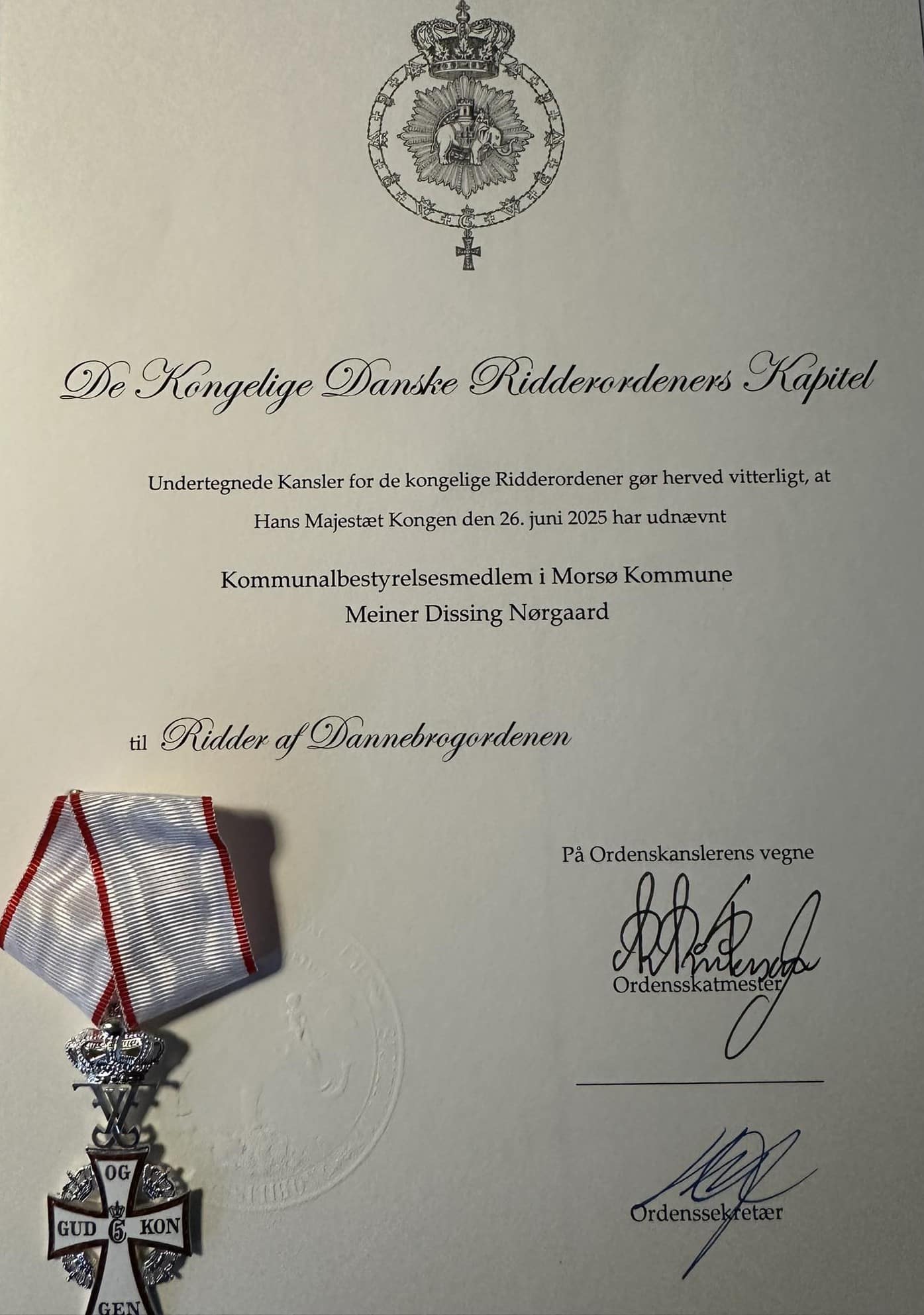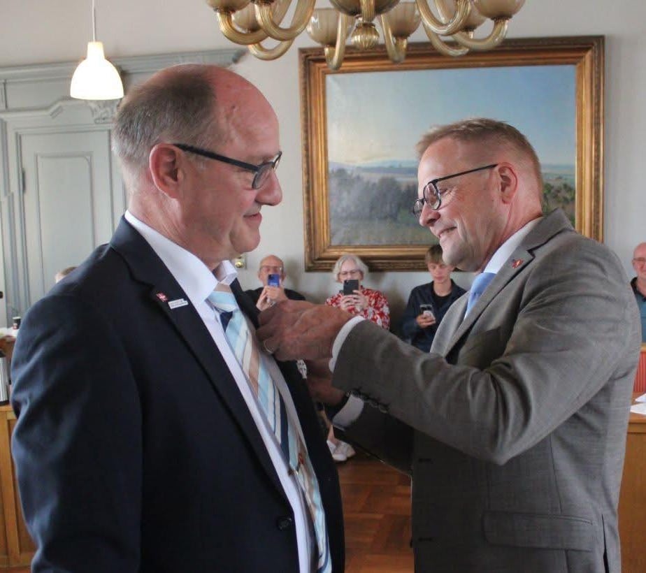 På kommunalbestyrelsesmødet i denne uge kunne borgmester Hans Ejner Bertelsen overrække den fornemme orden til øens 2. viceborgmester, Meiner Nørgaard.