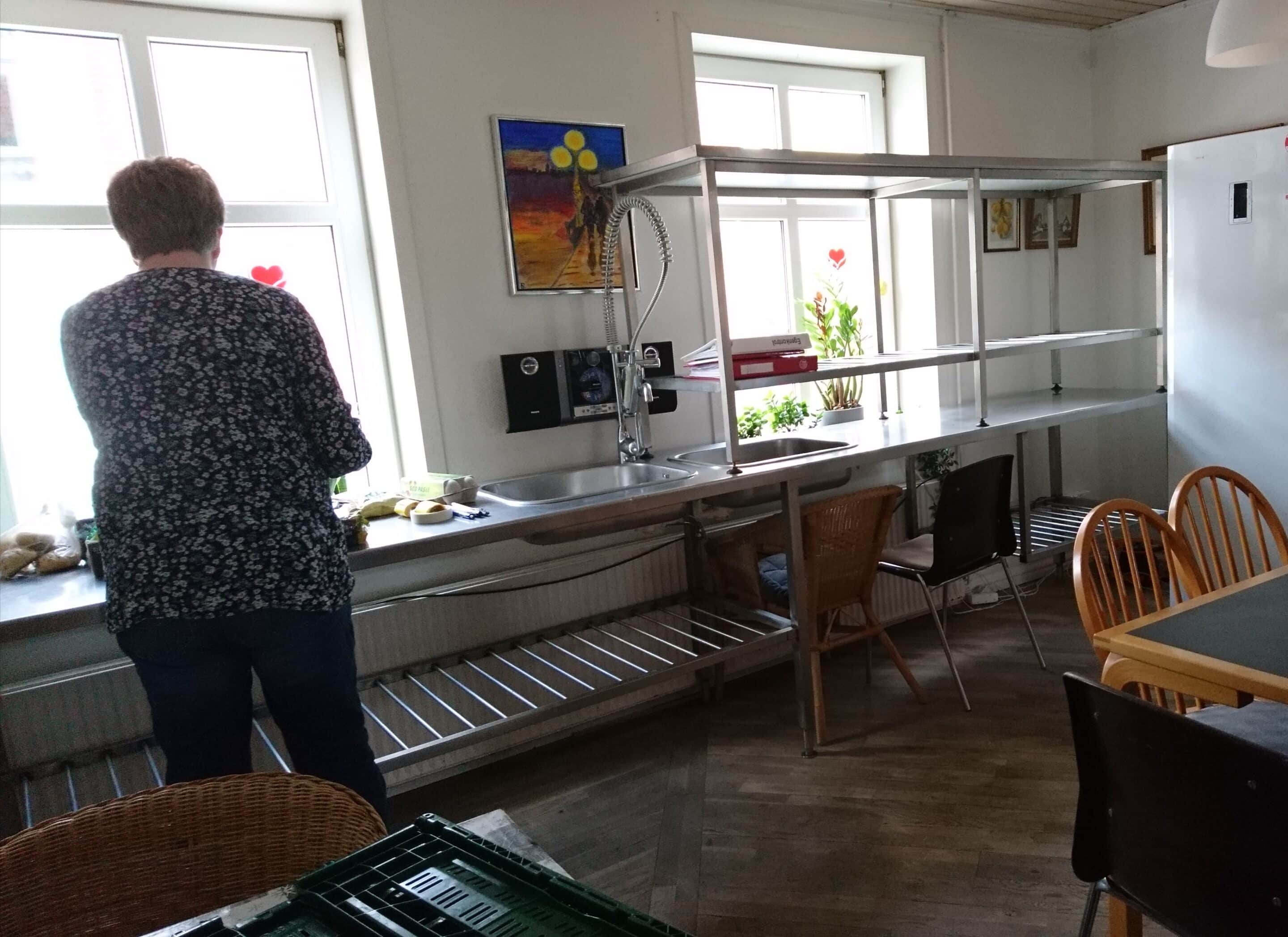 I øjeblikket er de store frysere og køkkenborde rykket ind i fællesstuen på Perlen, hvor køkkenleder Lone Nielsen er i fuld sving.