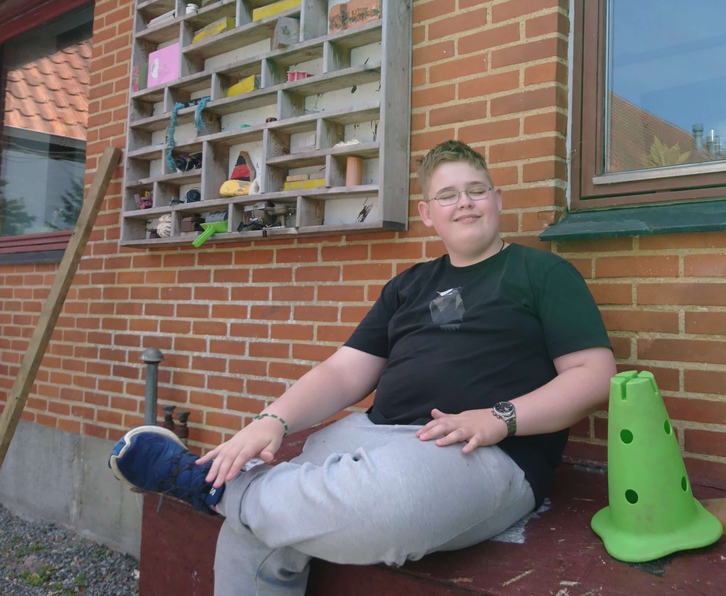 Det var på Lødderup Friskole, men det er to år siden nu, så når David efter sommerferien flytter tilbage til friskolen i Lødderup håber han, at mobningen er fortid. På Ørding Friskole har han haft det godt. Om den fine reol på muren bag sig fortæller David Noesgaard, at de små ting på hylderne er stillet derind af børn i tidens løb.