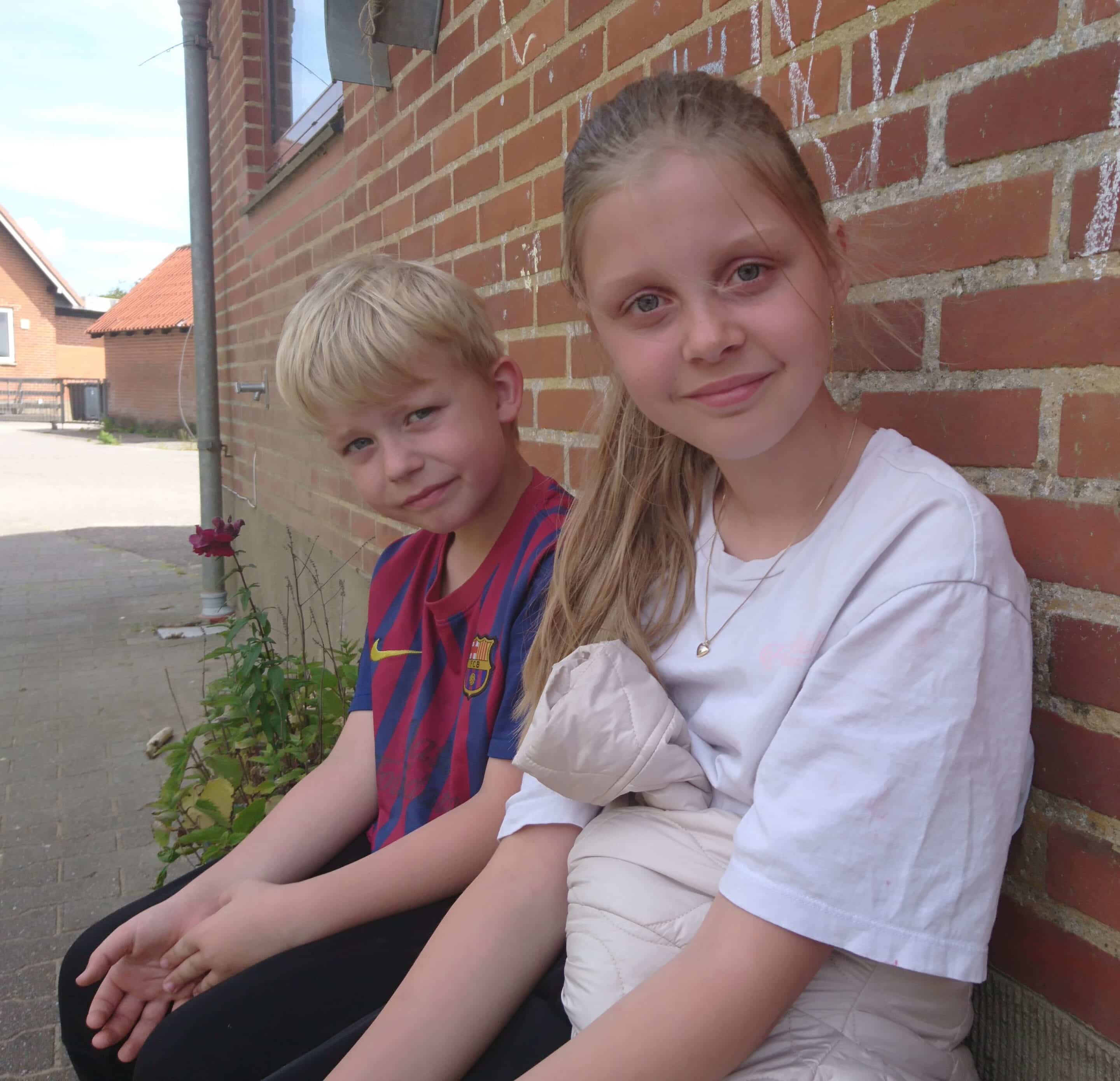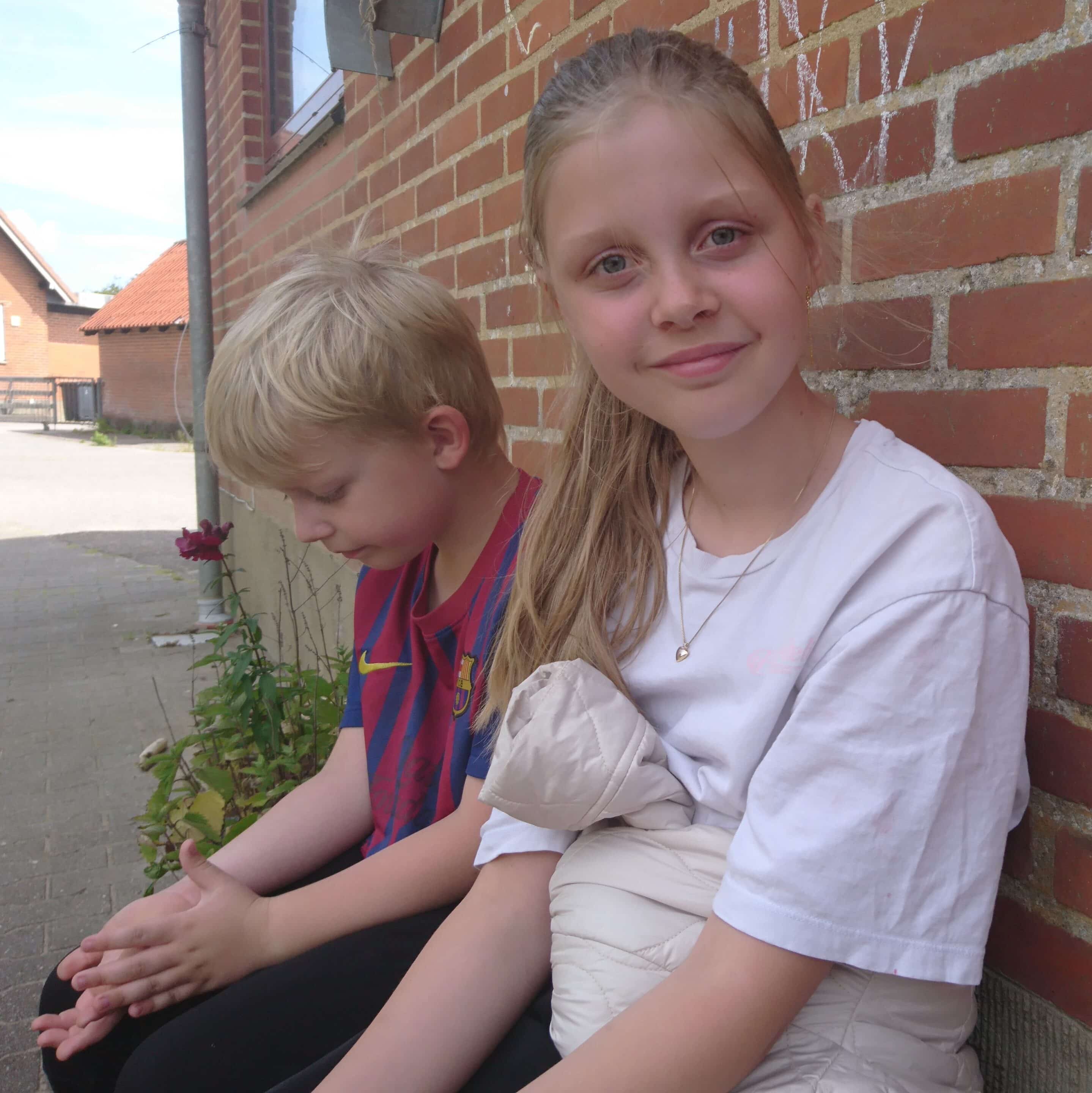 På en bænk op ad muren finder Her På Øen Christian Mo Andersen der går i 1. klasse, og Astrid Svane Sørensen fra 4. klasse.