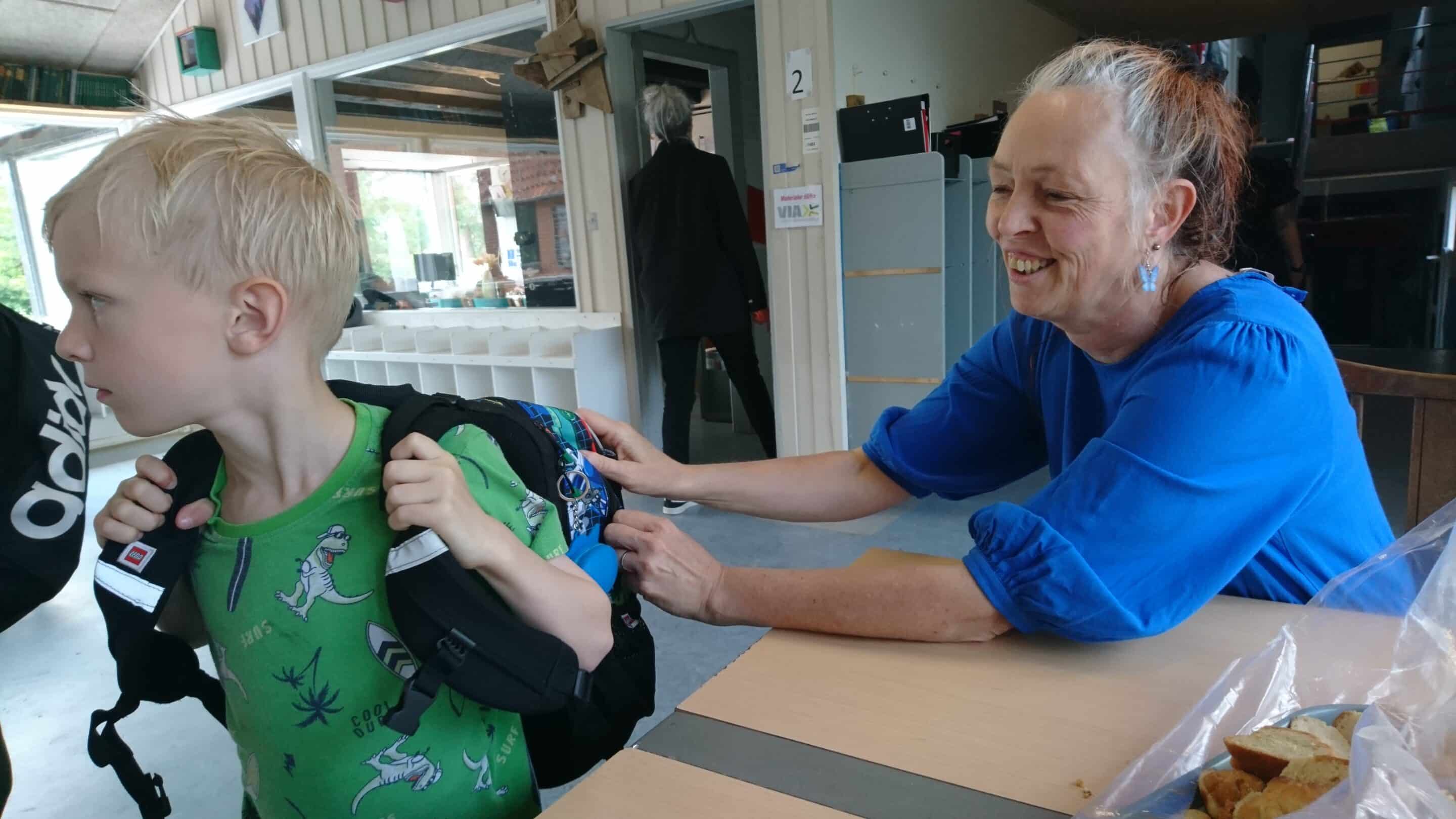 - Jeg har været svimmel indimellem i dag, og det er selvfølgelig også på grund af træthed. Men det er jo også de triste omstændigheder, siger hun til Her På Øen, mens hun hjælper Mikkel fra nulte klasse rygsækken bedre på.