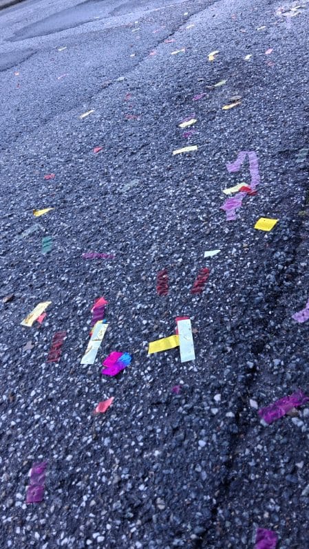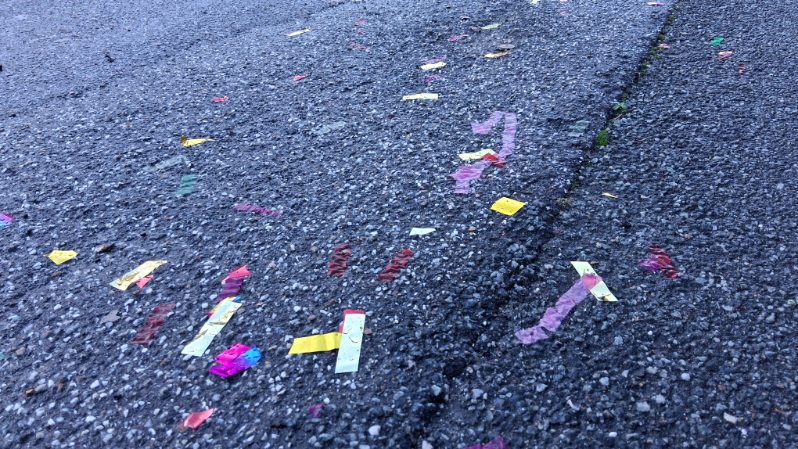 Som det fremgår af billederne her, ligger der farvestrålende konfetti fra årsskiftet og glitrer på både fortov og vej.