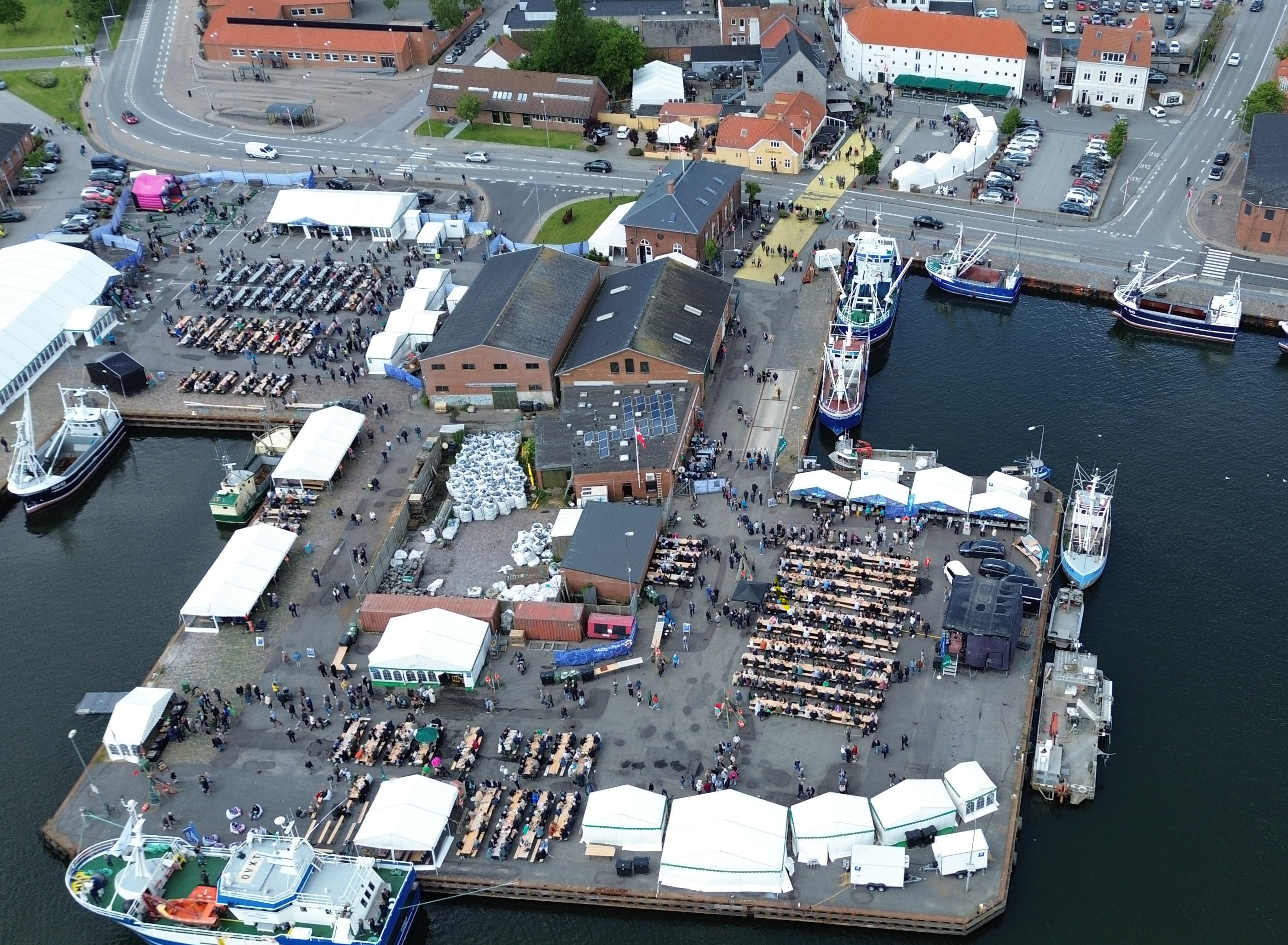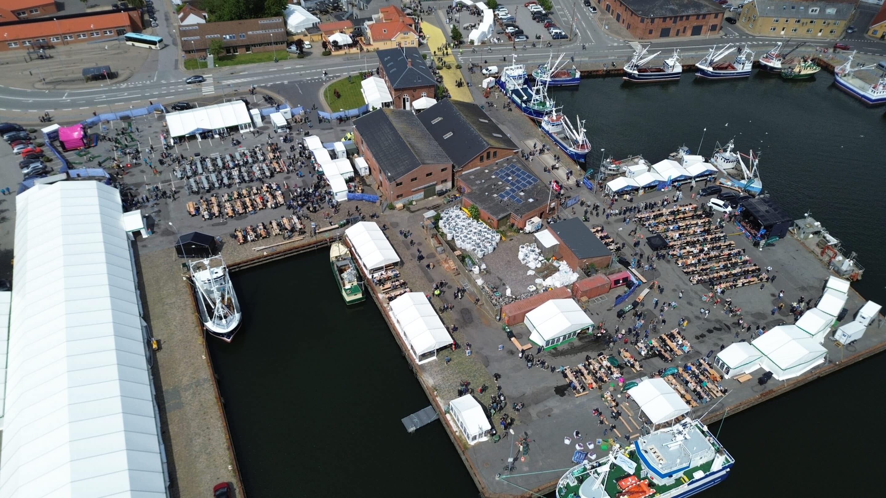Dronefotos fra René Jensen til Her På Øen. Når man ser det hele lidt fra oven, ses det store opbud af mennesker – og boder – tydeligt.