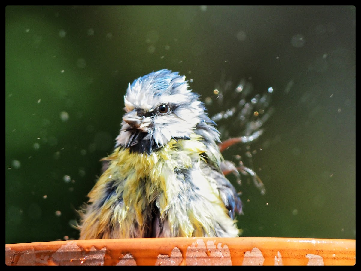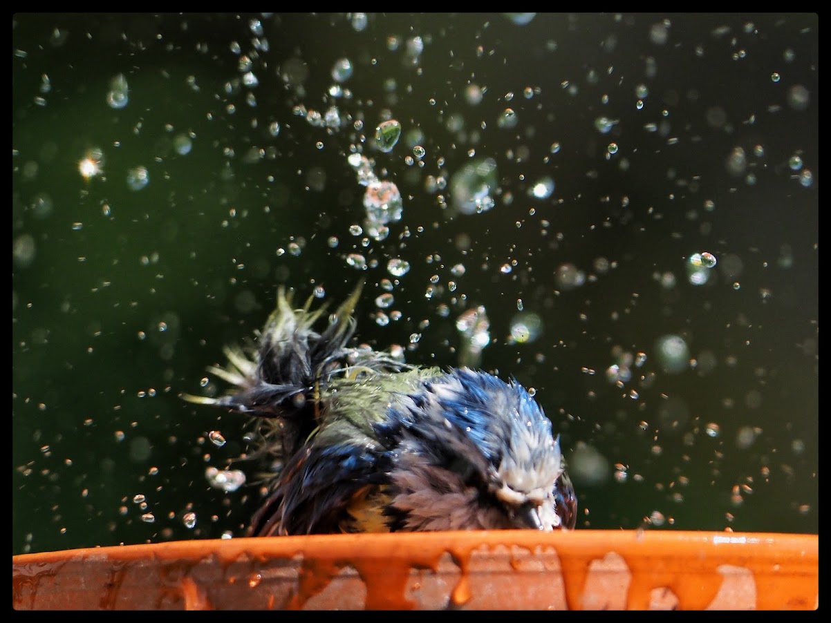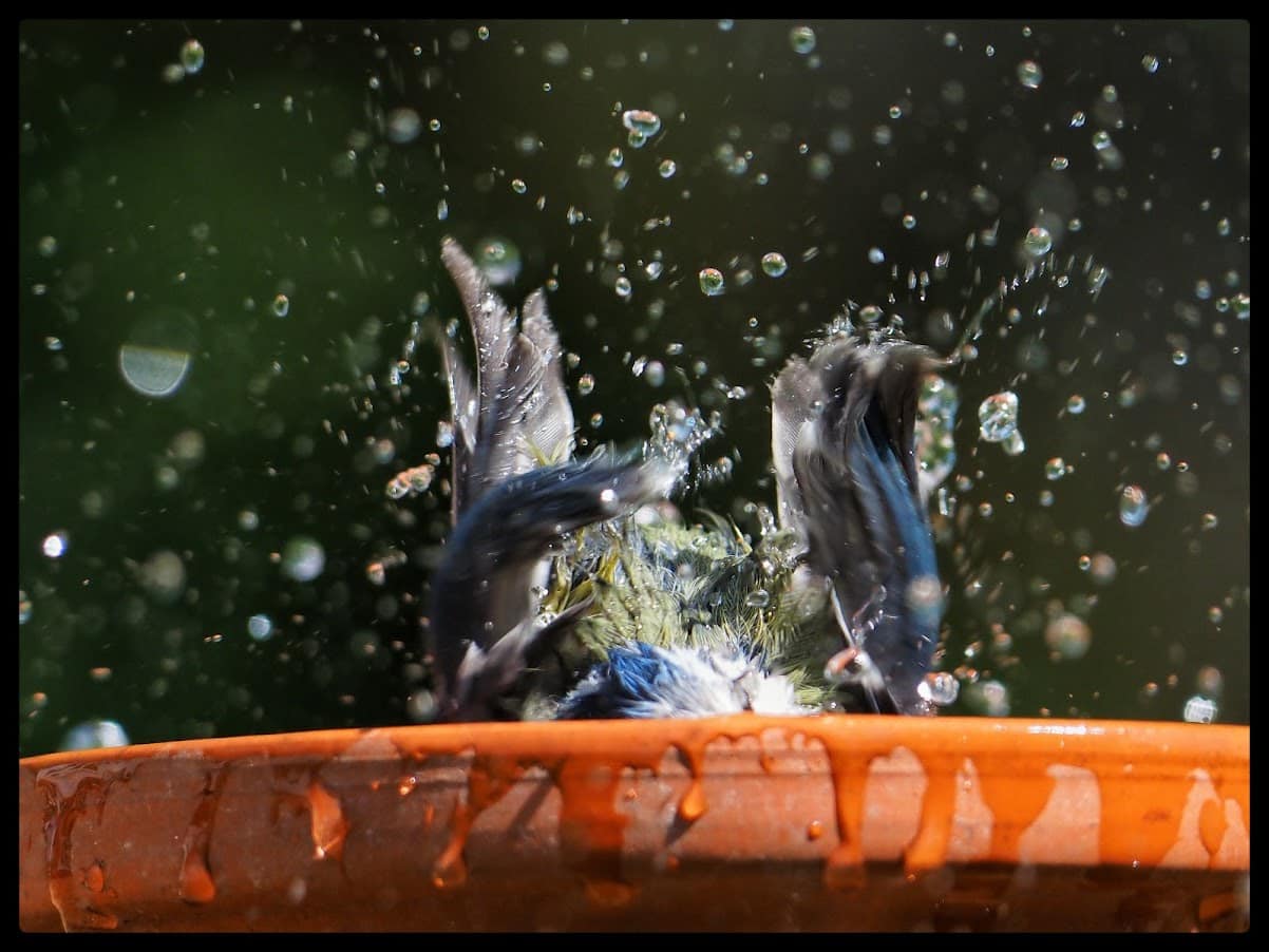 Morten Overgaards kamera har denne gang indfanget en badeseance for en yndig blåmejse, der nyder et forfriskende bad i den varme sol.